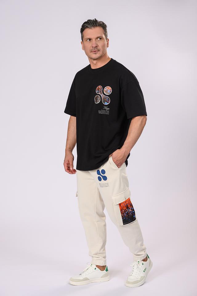 Основной цвет футболки – чёрный, что делает её универсальным элементом гардероба, легко сочетающимся с различными стилями одежды. Привлекает внимание оригинальный принт на груди и спине, выполненный в виде нескольких круглых изображений с цветочными мотивами.