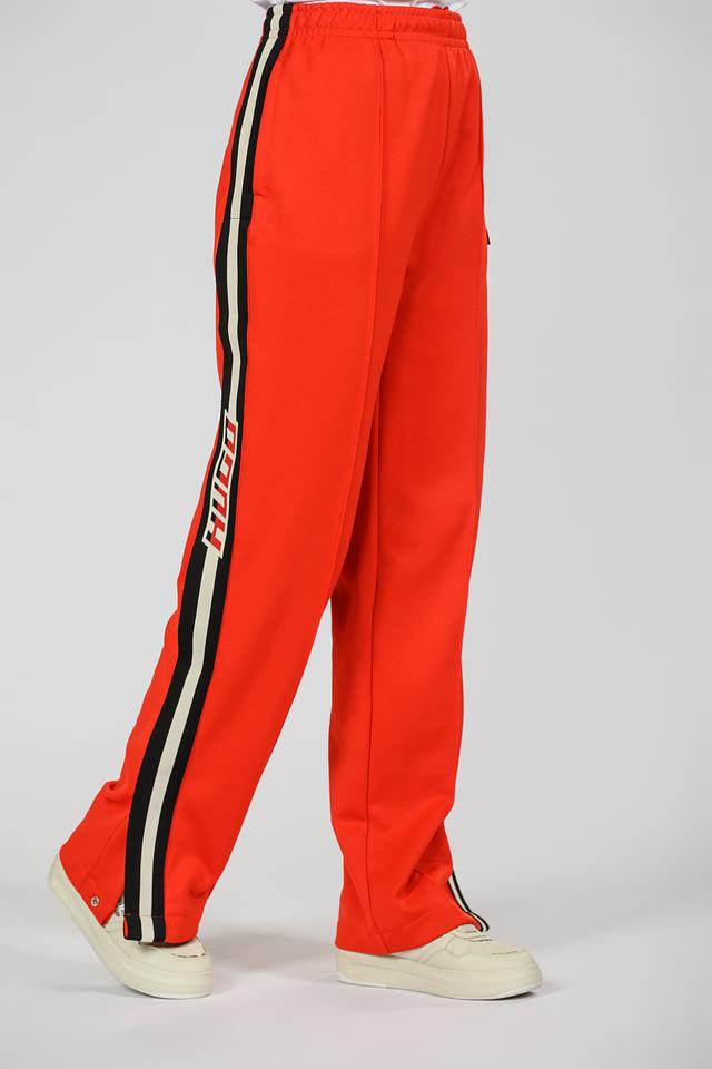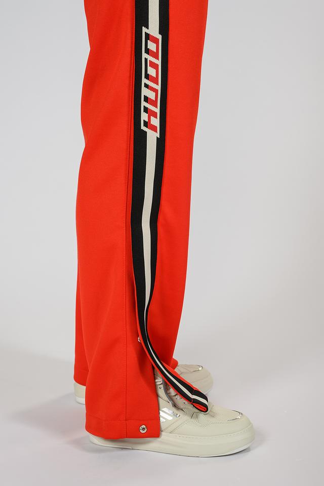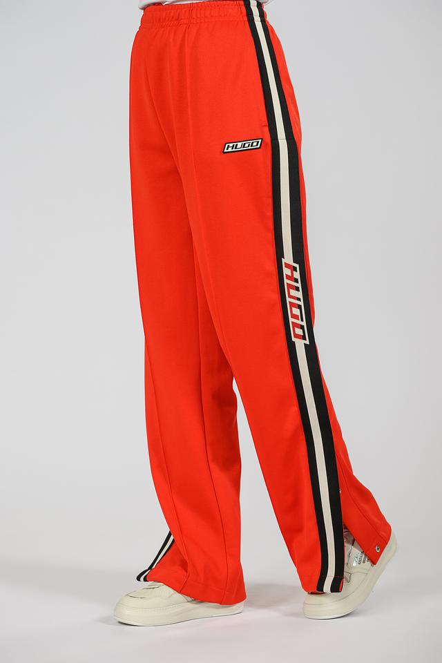 Представляем стильные спортивные брюки от бренда Hugo. Эта модель выполнена в ярком оранжевом цвете и отличается контрастными полосками по бокам, добавляющими динамичности образу.