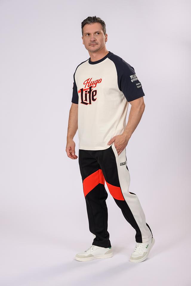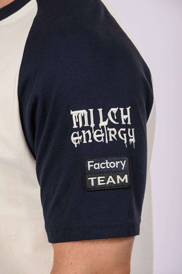 Дизайн футболки отличается ярким и запоминающимся принтом "Hugo Life" на груди, выполненным в красных и черных тонах. Контрастные темно-синие вставки на плечах и рукавах добавляют динамичности образу. На левом рукаве расположен дополнительный логотип и надпись "MILCH ENERGY Factory TEAM".