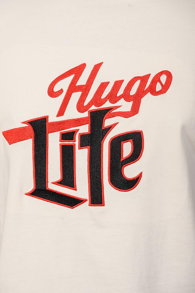 Мужская футболка Hugo Life бежевого цвета с ярким принтом на груди и контрастными вставками. Изготовлена из 100% хлопка, обеспечивая комфорт и воздухопроницаемость. Стильный дизайн и высокое качество. Состав: хлопок 100%