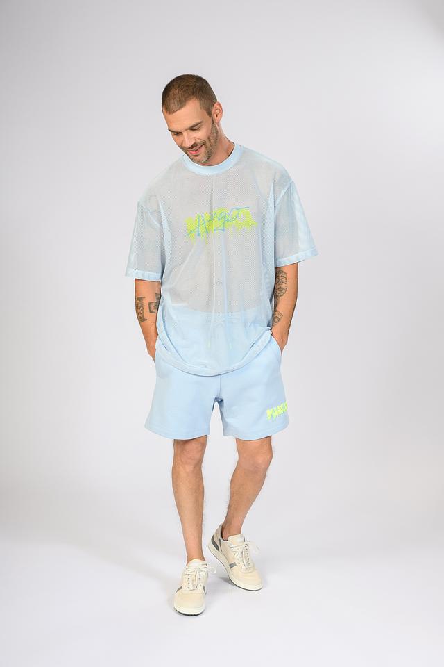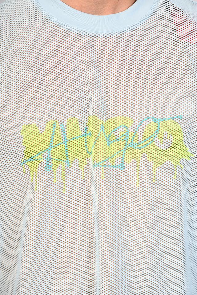 Особенностью данной модели является сетчатая текстура, которая придает ей современный и оригинальный вид. На передней части футболки расположен яркий логотип бренда, выполненный в кислотных оттенках, что добавляет динамичности образу.