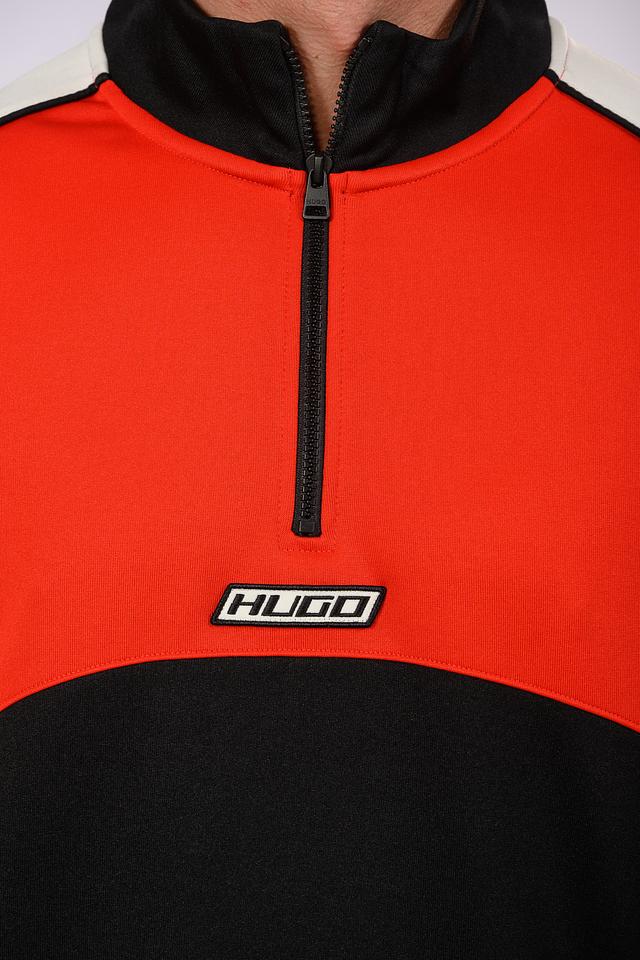Мужской пуловер Hugo яркого дизайна, сочетающий в себе чёрный, красный, белый и бежевый цвета. Модель с молнией и логотипом бренда на груди станет стильным дополнением к вашему гардеробу. Состав: полиэстер 70%, хлопок 30%