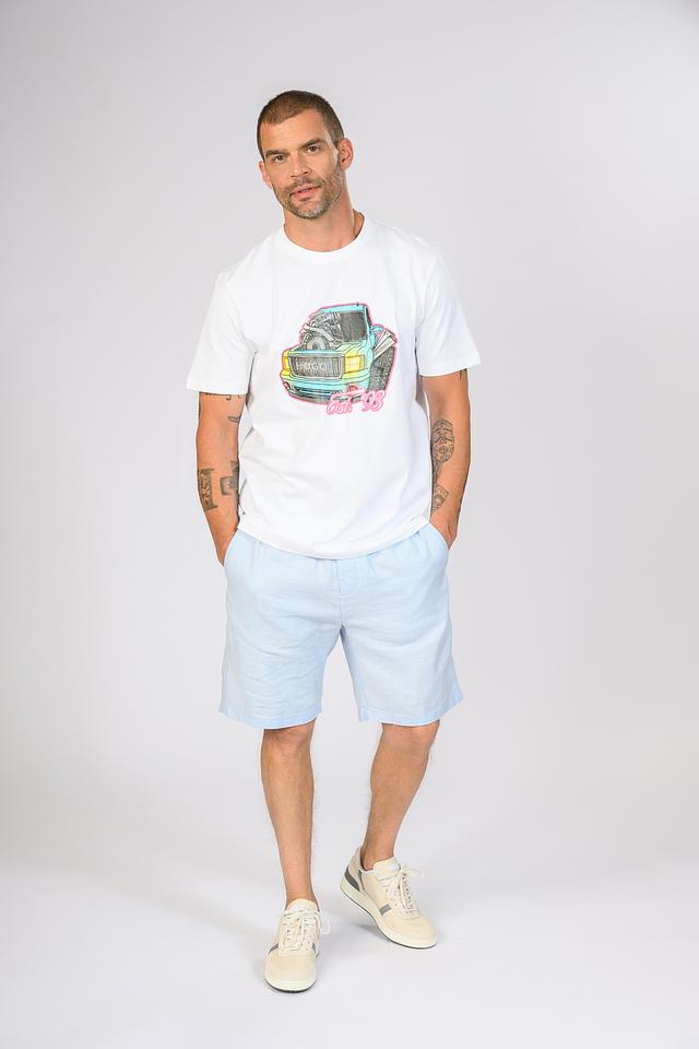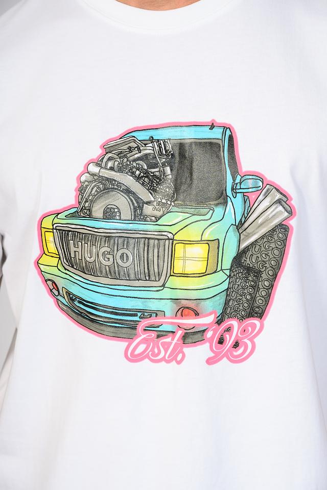 Белая футболка Hugo с ярким принтом автомобиля. Изготовлена из 100% хлопка, обеспечивая комфорт и воздухопроницаемость. Стильный и оригинальный выбор для повседневного образа. Состав: хлопок 100%