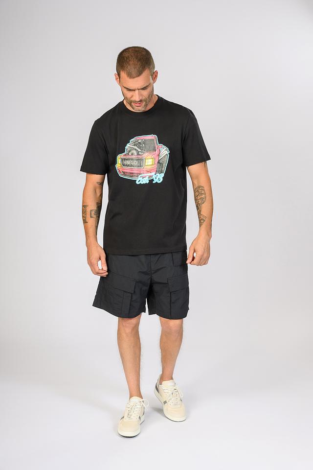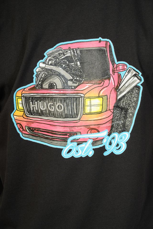 Чёрная футболка Hugo с ярким принтом автомобиля. Изготовлена из 100% хлопка, обеспечивая комфорт и воздухопроницаемость. Стильный дизайн и высокое качество материалов делают эту футболку отличным выбором для повседневного гардероба. Состав: хлопок 100%