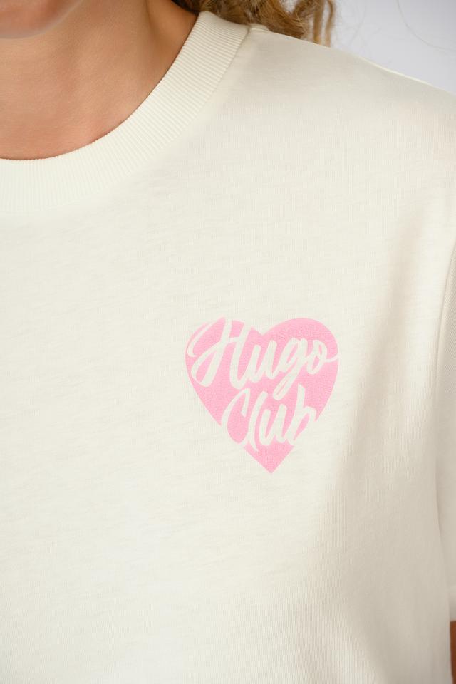 Женская футболка Hugo белого цвета с принтом "Hugo Club" в виде розового сердца. Изготовлена из 100% хлопка, обеспечивающего комфорт и воздухопроницаемость. Стильный и лаконичный дизайн. Состав: хлопок 100%