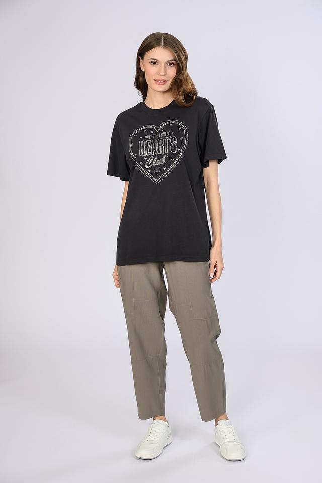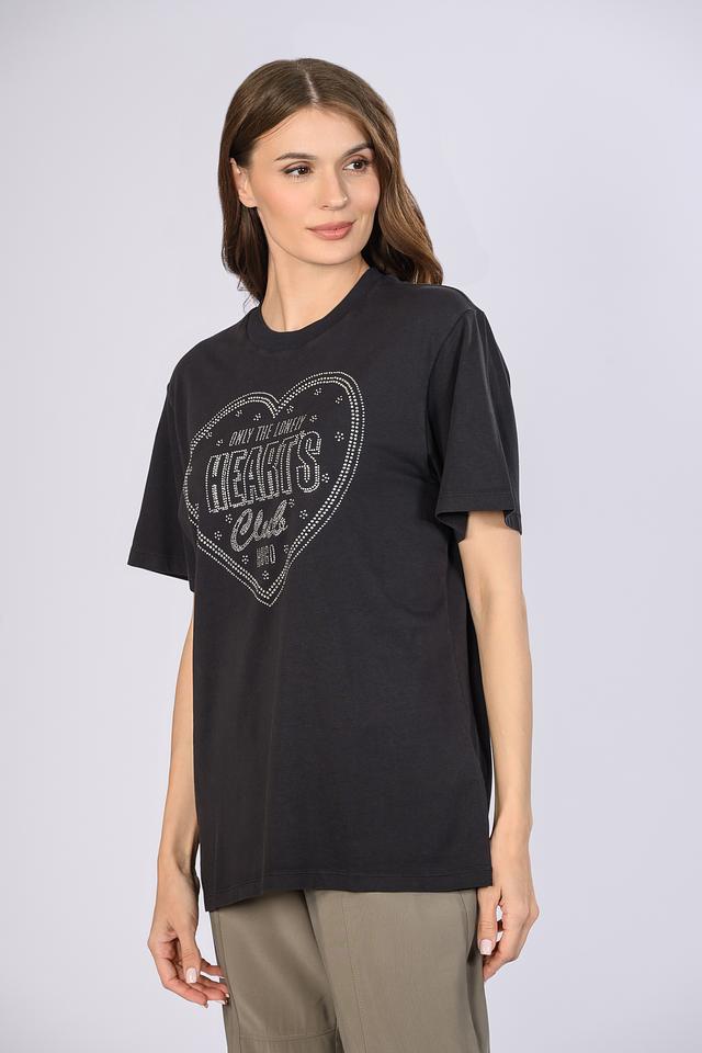 Основным акцентом является яркий принт в форме сердца, полностью расшитый стразами, что придает изделию особую изысканность и привлекательность. Футболка имеет свободный крой, который обеспечивает свободу движений и комфорт в течение всего дня.