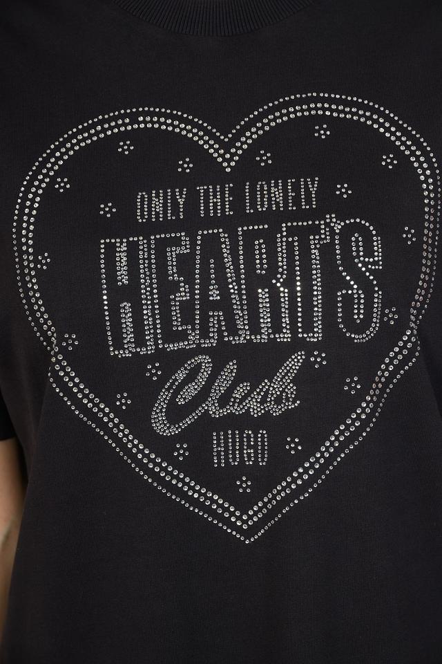 Чёрная футболка Hugo женского кроя с эффектным принтом в виде сердца, украшенного стразами. Изготовлена из 100% хлопка, обеспечивающего комфорт в носке. Стильный и современный выбор для повседневного образа. Состав: хлопок 100%