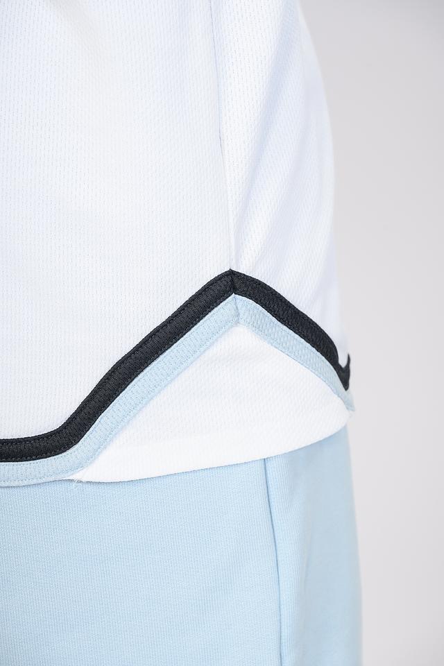 Дизайн футболки выполнен в спортивном стиле, вдохновленном баскетбольной формой. Широкие вырезы на рукавах и по бокам обеспечивают свободу движений, а контрастная черная и голубая отделка добавляет динамичности образу.