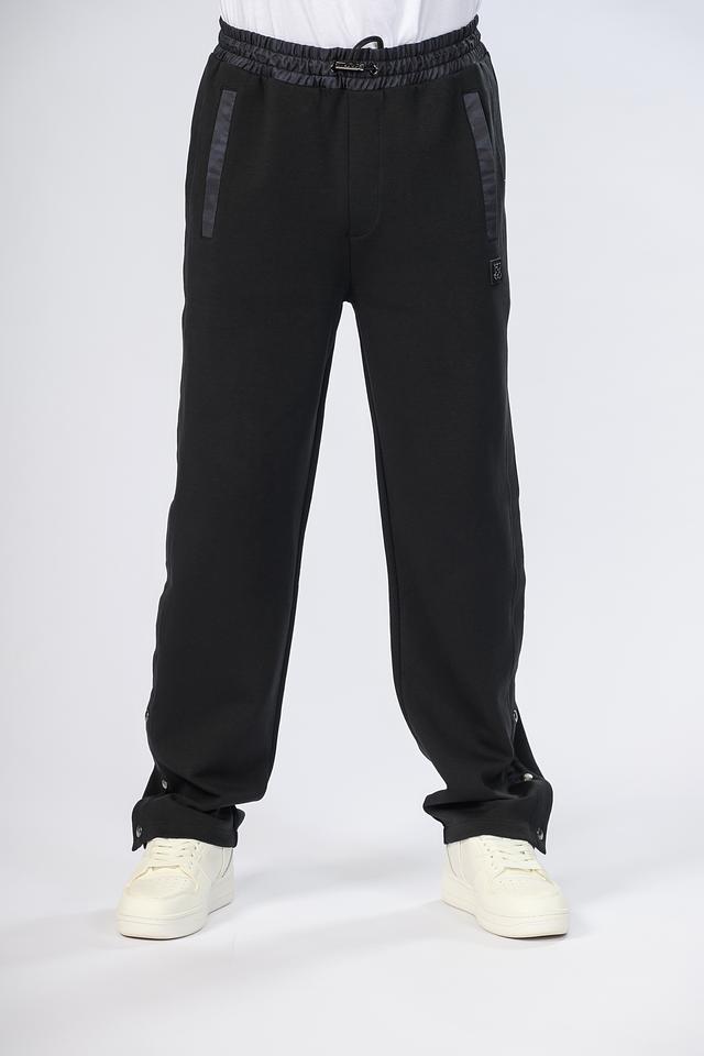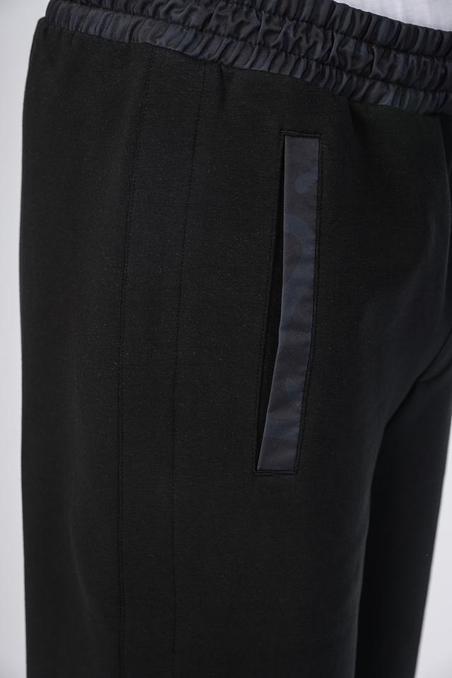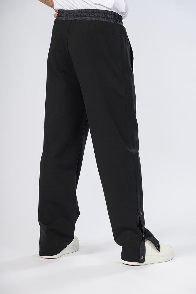 Дизайн брюк дополнен боковыми карманами и оригинальной отделкой в виде вставки на карманах. Застёжка на кнопках в нижней части штанин позволяет регулировать ширину брюк. Данная модель идеально подходит для создания как спортивных, так и повседневных образов.