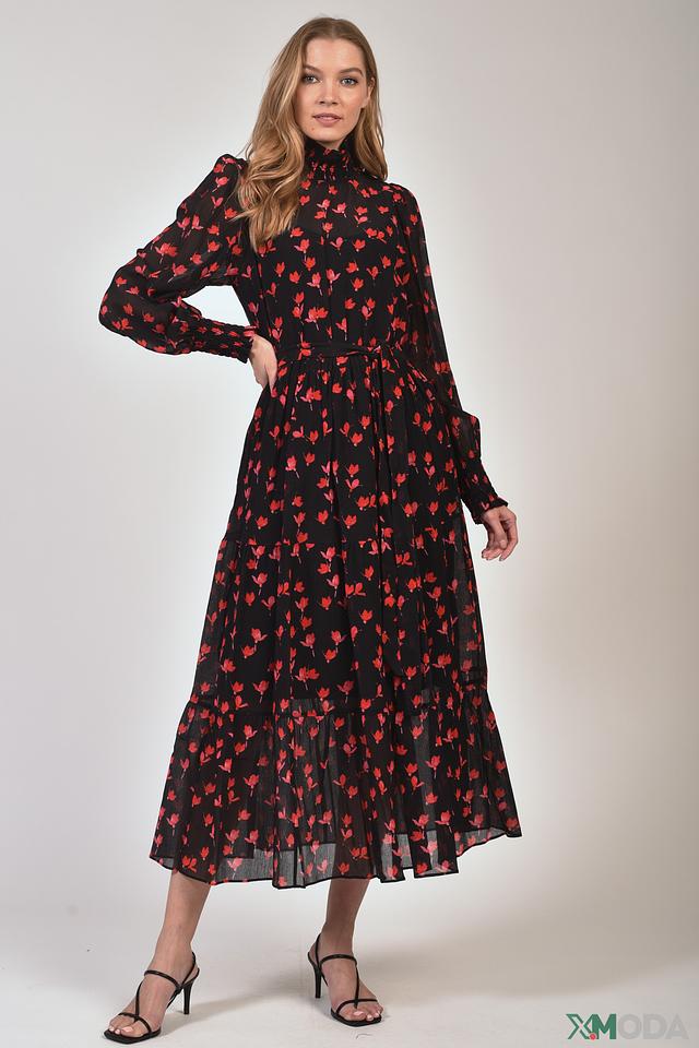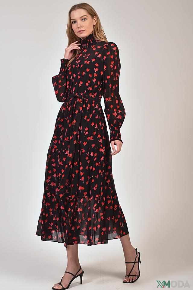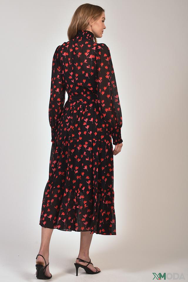 Платье имеет длину миди, длинные рукава с небольшими сборками на манжетах и высокий воротник-стойку. Приталенный силуэт подчеркивается тонким поясом, который можно завязать на талии для создания более выразительного образа.