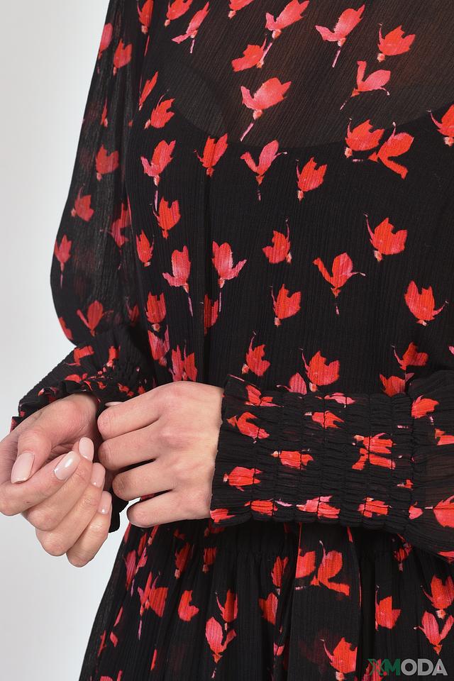 Это платье от Hugo – воплощение женственности и стиля. Выполнено в черном цвете и украшено ярким принтом из красных цветов, что придает образу особую выразительность.