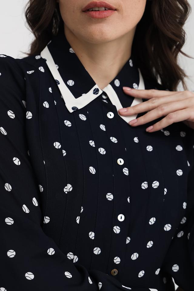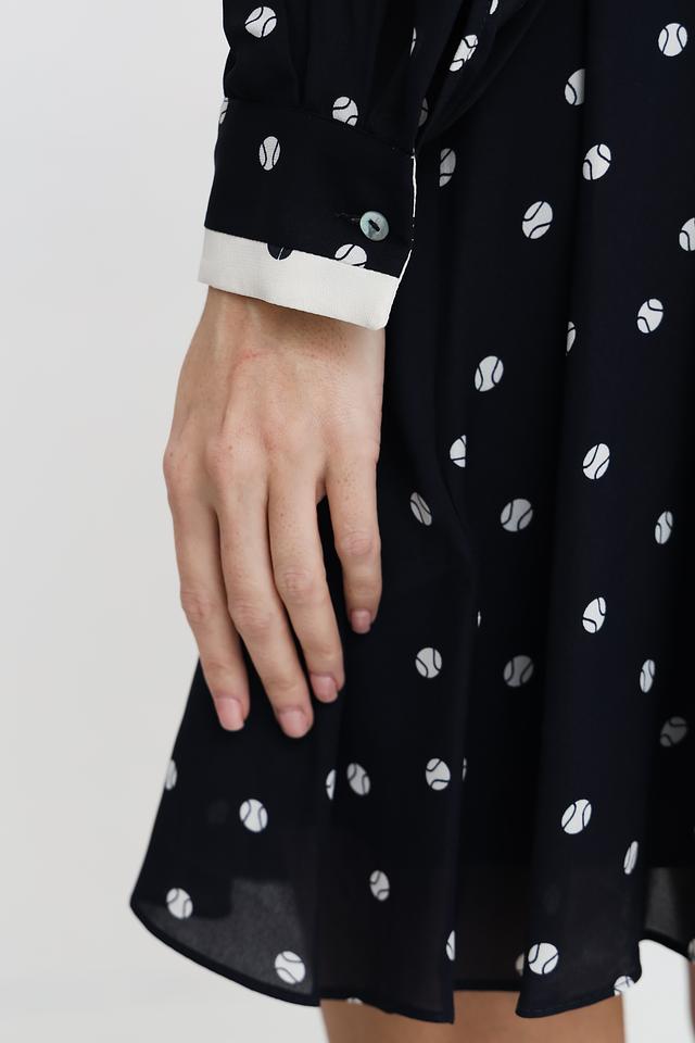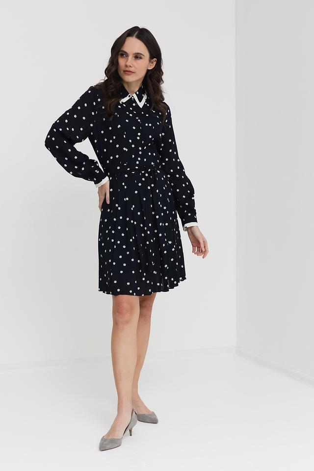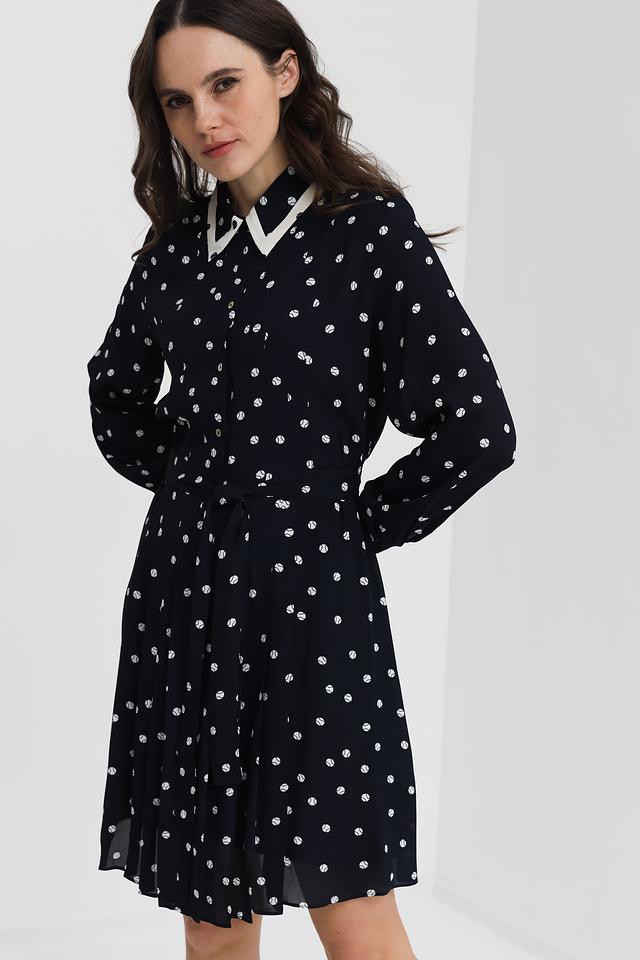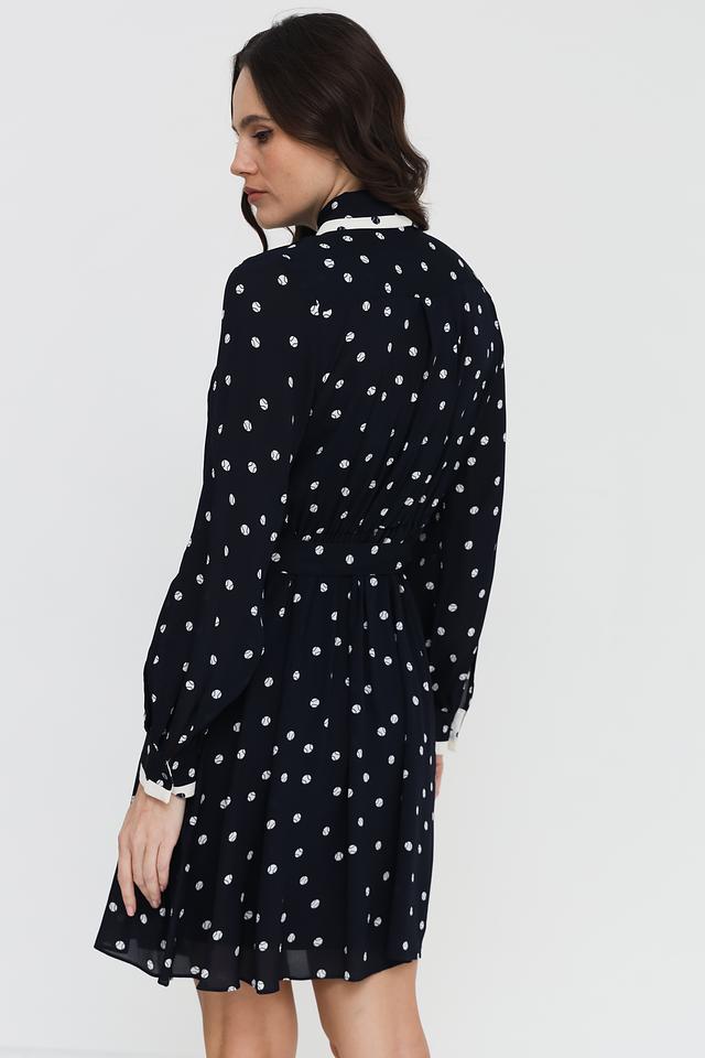 Платье имеет длинные рукава, воротник с белой отделкой и застежку на пуговицы по всей длине. Приталенный силуэт подчеркивается поясом, который можно завязать на талии, чтобы выделить фигуру. Юбка платья слегка расклешена, что придает ему легкость и воздушность.