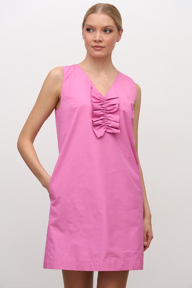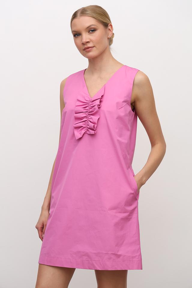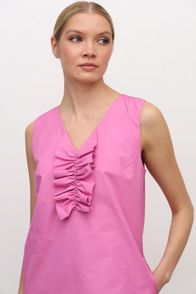 Модель имеет прямой силуэт, длину до колена и лишен рукавов. V-образный вырез горловины украшен декоративной рюшей, которая придает платью изящность и оригинальность. Боковые швы предусматривают наличие удобных карманов.