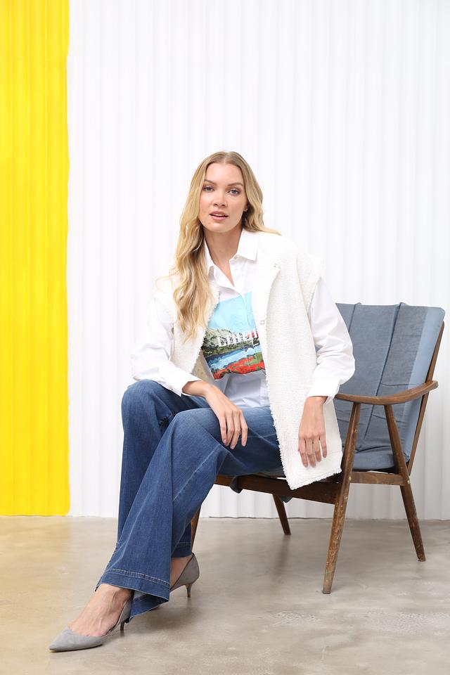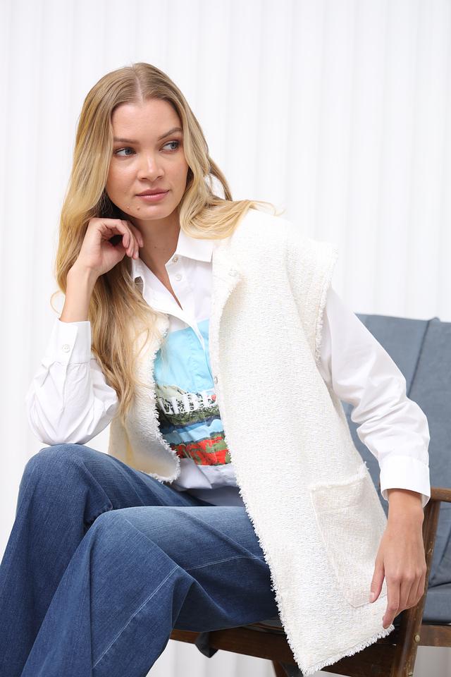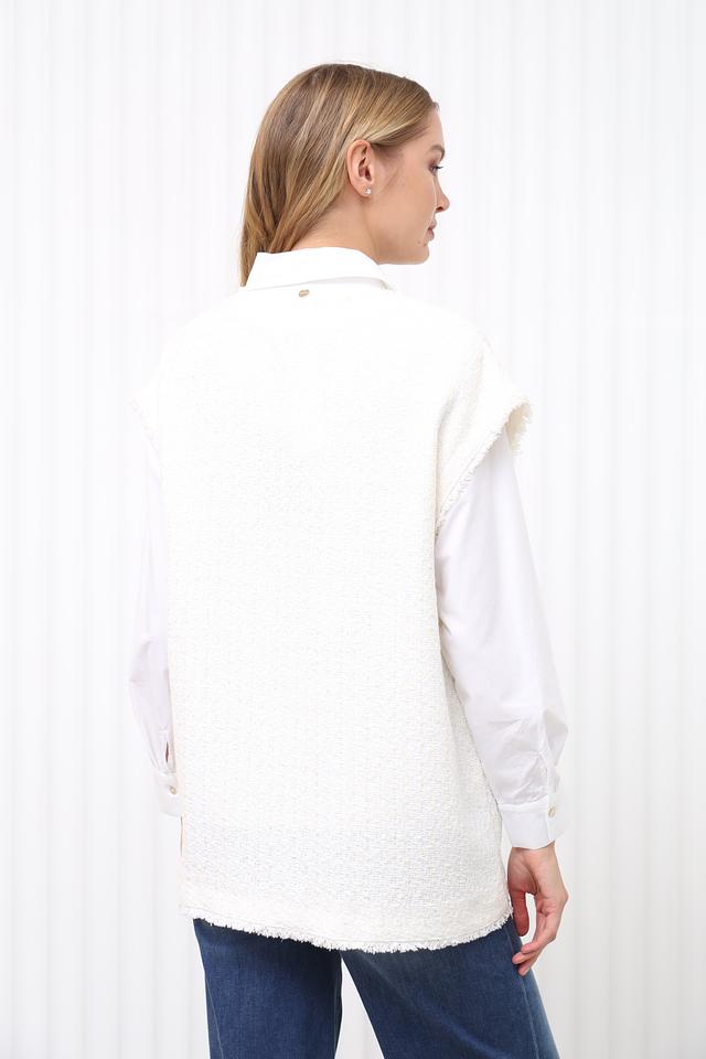 Жилет имеет свободный крой, который обеспечивает комфорт и свободу движений. V-образный вырез подчеркивает линию шеи и делает силуэт более изящным. Два накладных кармана добавляют функциональности и практичности.