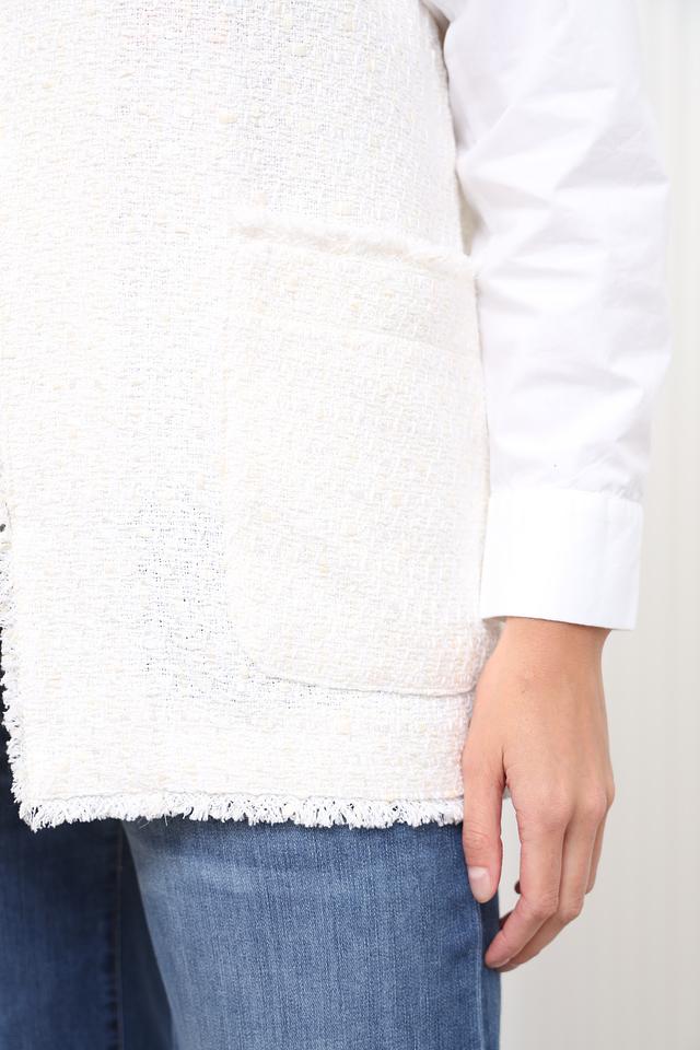 Ткань жилета имеет интересную фактуру, напоминающую "пушистость", что придает ему особый шарм. Состав ткани включает хлопок, полиэстер, нейлон, альтре фибру и акрил, что обеспечивает приятные тактильные ощущения и долговечность изделия.