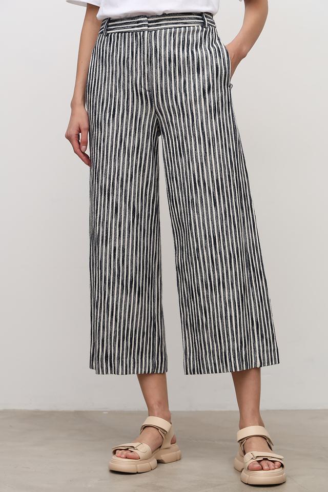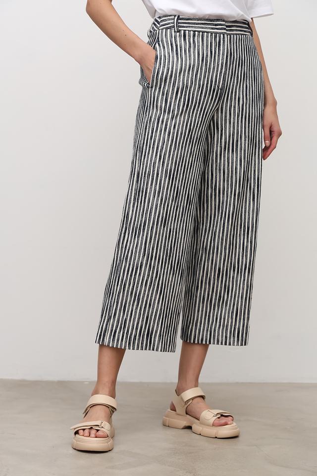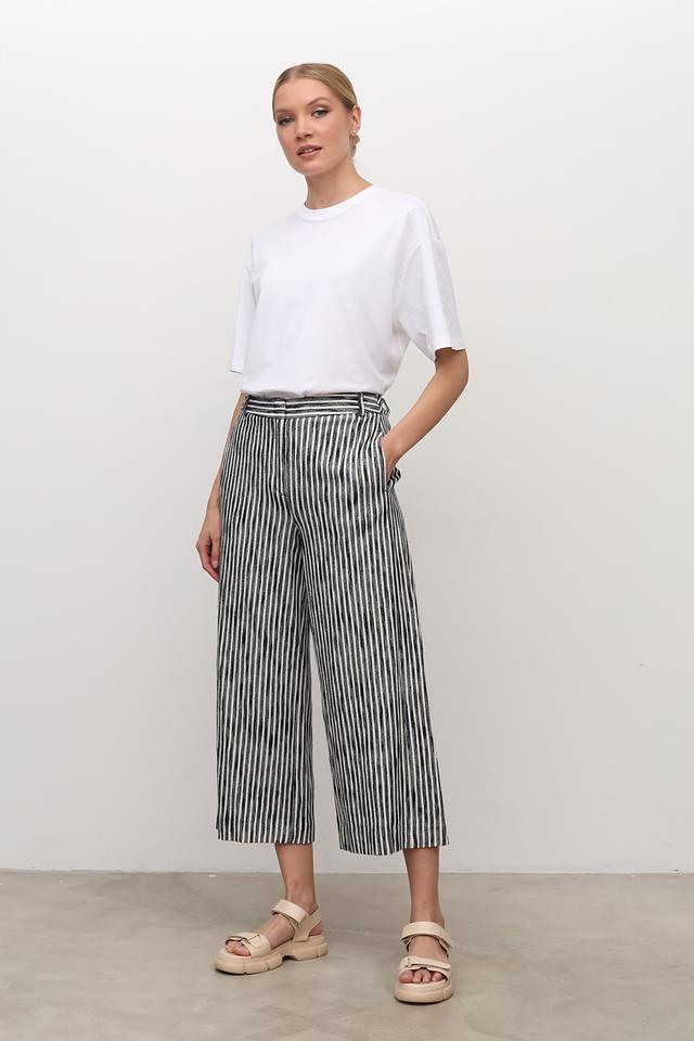 Женские брюки i Blues чёрно-белого цвета с вертикальной полоской. Модель выполнена в свободном крое с завышенной талией и широкими штанинами, что обеспечивает комфорт и стильный образ. Состав: хлопок 100%