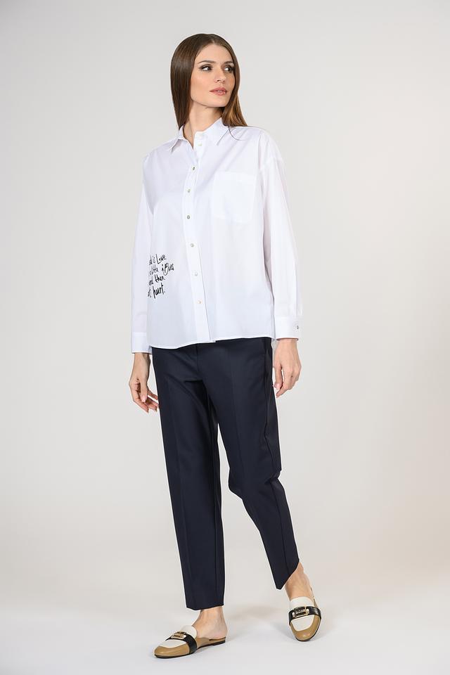 Рубашка имеет прямой крой, длинные рукава и воротник классической формы. На груди расположен оригинальный принт, добавляющий индивидуальности. Застежка на пуговицы обеспечивает удобство ношения.