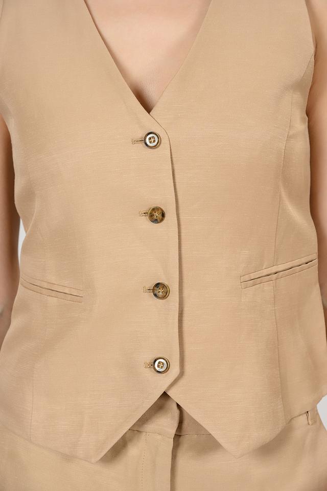 Жилет имеет классический крой с V-образным вырезом и застежкой на пуговицы. Он изготовлен из высококачественного льна с добавлением вискозы, что обеспечивает комфорт и приятные тактильные ощущения.