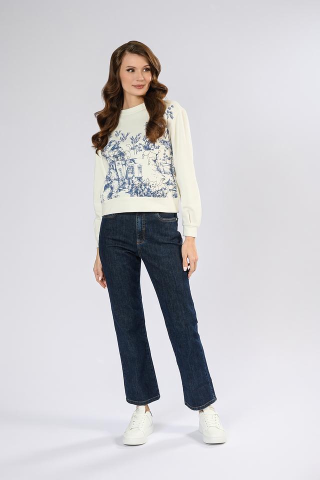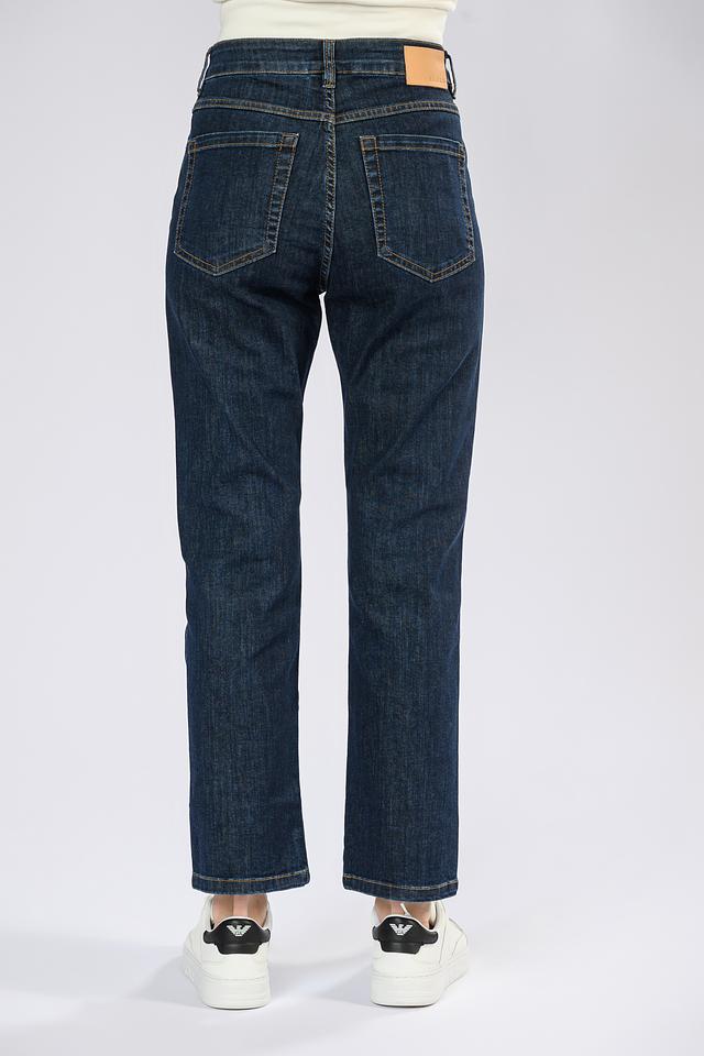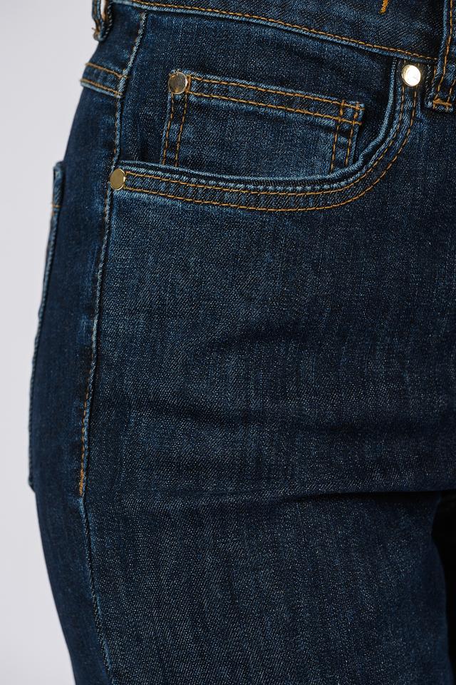Джинсы имеют высокую посадку, что визуально удлиняет ноги и подчеркивает талию. Ткань состоит из 94% хлопка, 4% полиэстера и 2% эластана, что обеспечивает комфорт, воздухопроницаемость и небольшую эластичность.
