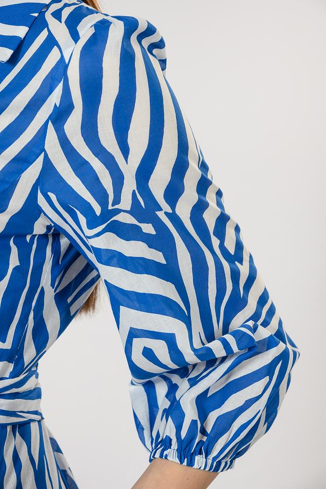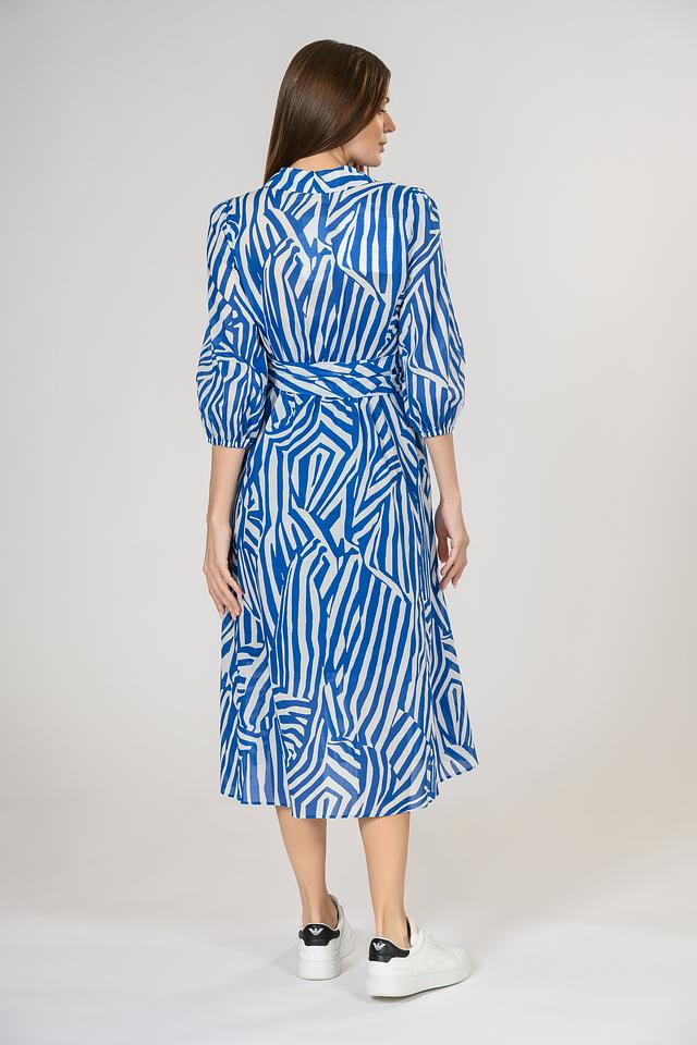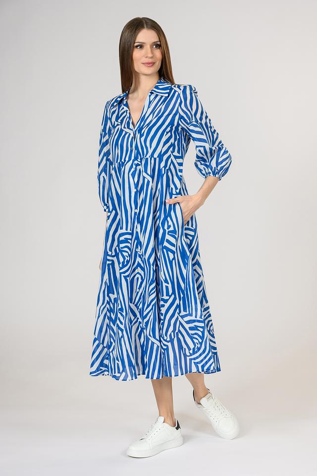 Модель имеет яркий синий цвет с белым геометрическим принтом в виде полосок. Платье застегивается на пуговицы по всей длине и имеет воротник рубашечного типа. Рукава длиной 3/4 со сборкой на манжетах.