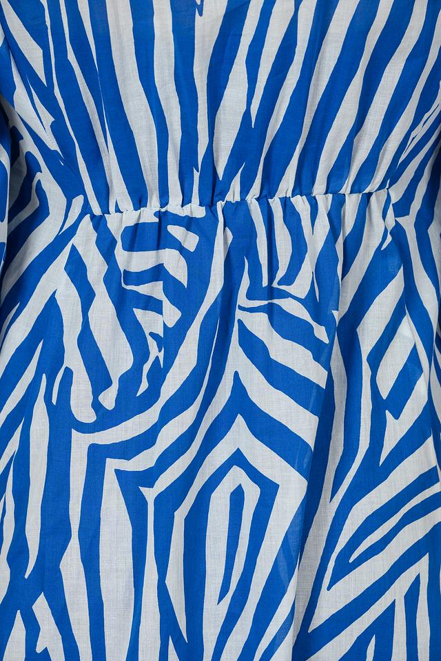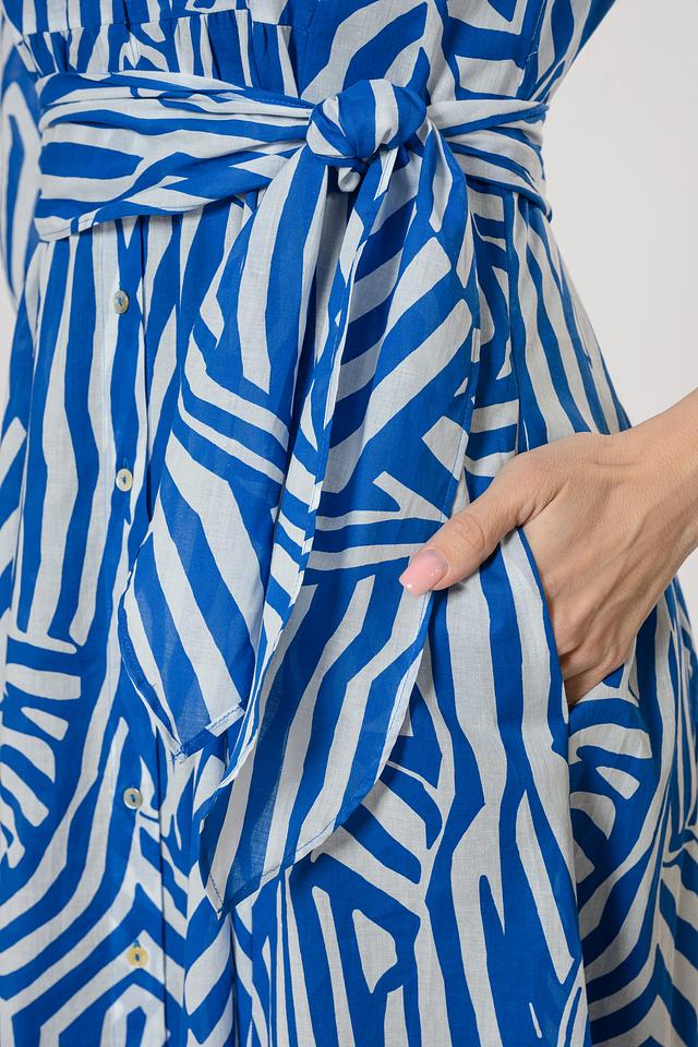 Синее платье от i Blues с ярким геометрическим принтом и рукавами 3/4. Модель выполнена из 100% хлопка, имеет завязки на талии и воротник рубашечного типа. Состав: хлопок 100%, Состав_подкладка полиэстер 100%
