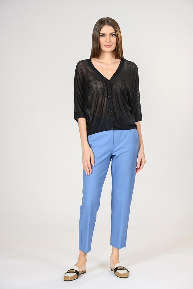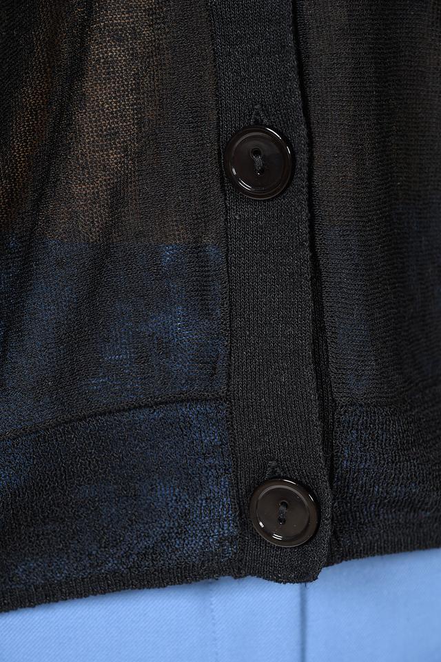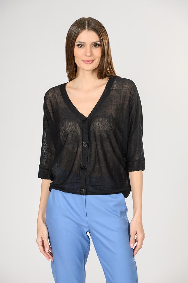 Передняя часть джемпера застегивается на пуговицы, что позволяет создавать различные образы. Полупрозрачная текстура ткани придает изделию легкость и воздушность. Этот джемпер идеально подойдет для создания повседневных и вечерних образов.