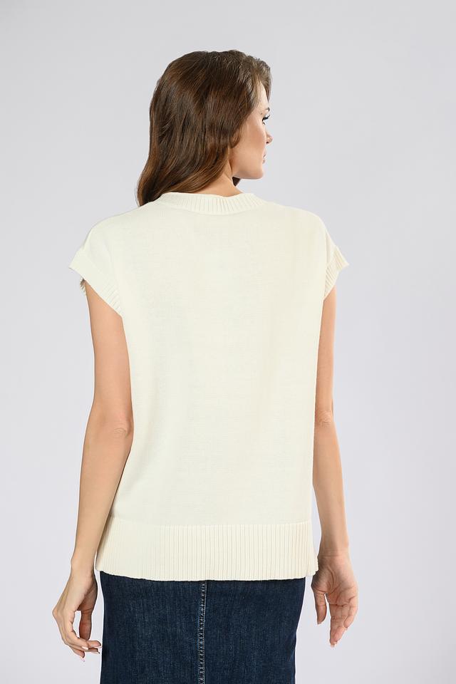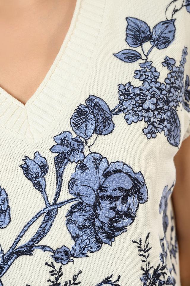 Этот женский жилет от i Blues выполнен в кремовом цвете и украшен эффектным цветочным принтом в синих тонах. Модель имеет V-образный вырез и короткие рукава, что делает ее идеальным выбором для теплой погоды.