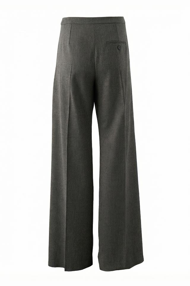 Брюки имеют широкий крой, который визуально удлиняет ноги и придает силуэту изящество. Высокая посадка подчеркивает талию и обеспечивает комфортную посадку. Ткань состоит из полиэстера (68%), вискозы (29%) и эластана (3%), что обеспечивает приятные тактильные ощущения, хорошую драпировку и небольшую эластичность.