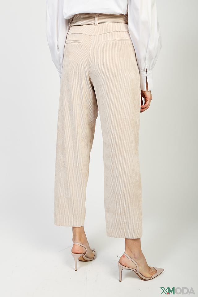 Брюки имеют прямой, слегка свободный крой, который обеспечивает комфорт в движении. Завышенная талия и пояс-завязка акцентируют внимание на фигуре и позволяют регулировать посадку. Текстурированная ткань с вертикальной полоской придает брюкам особый шарм и визуально вытягивает силуэт.