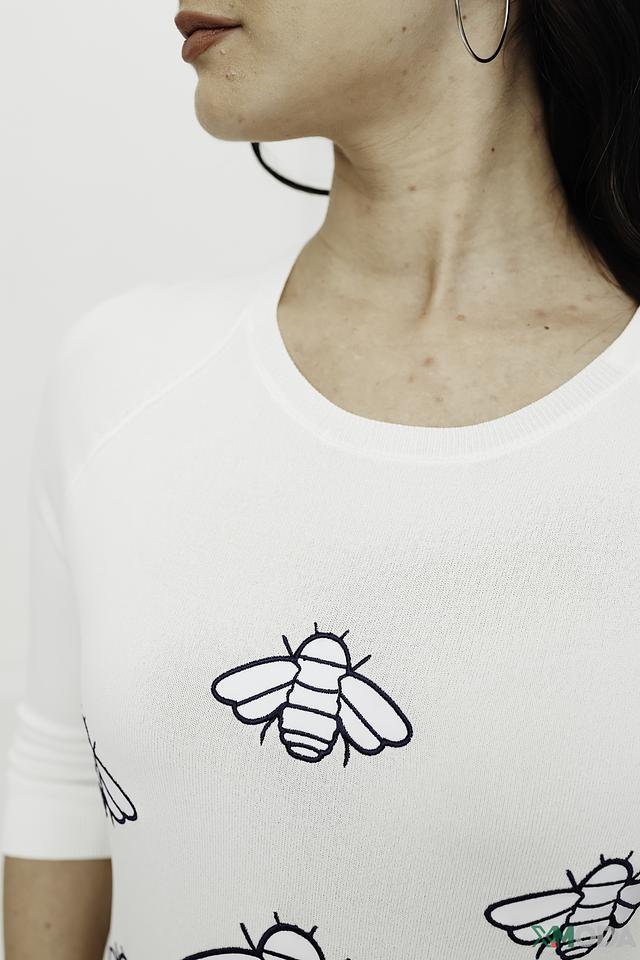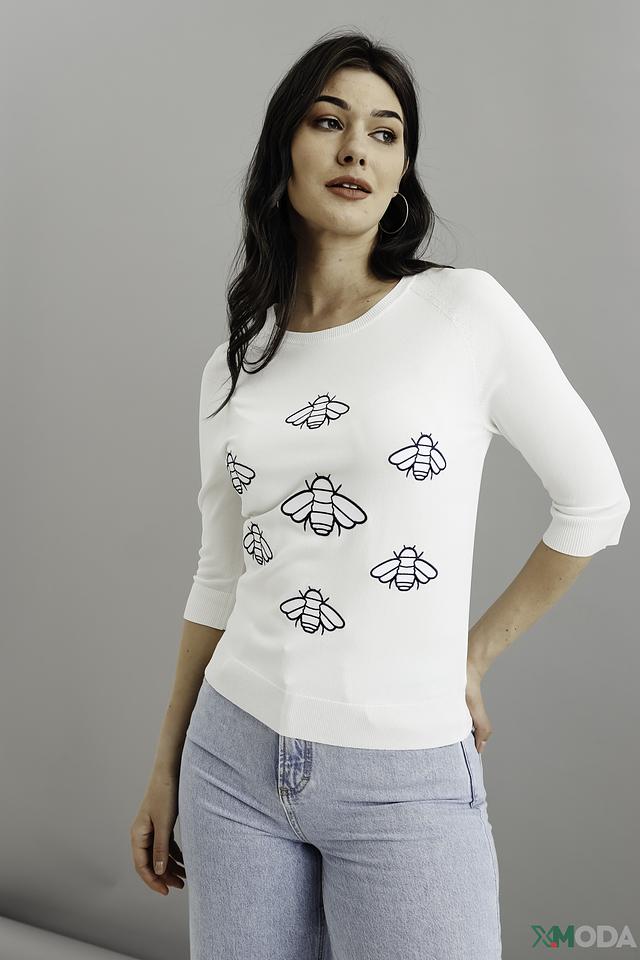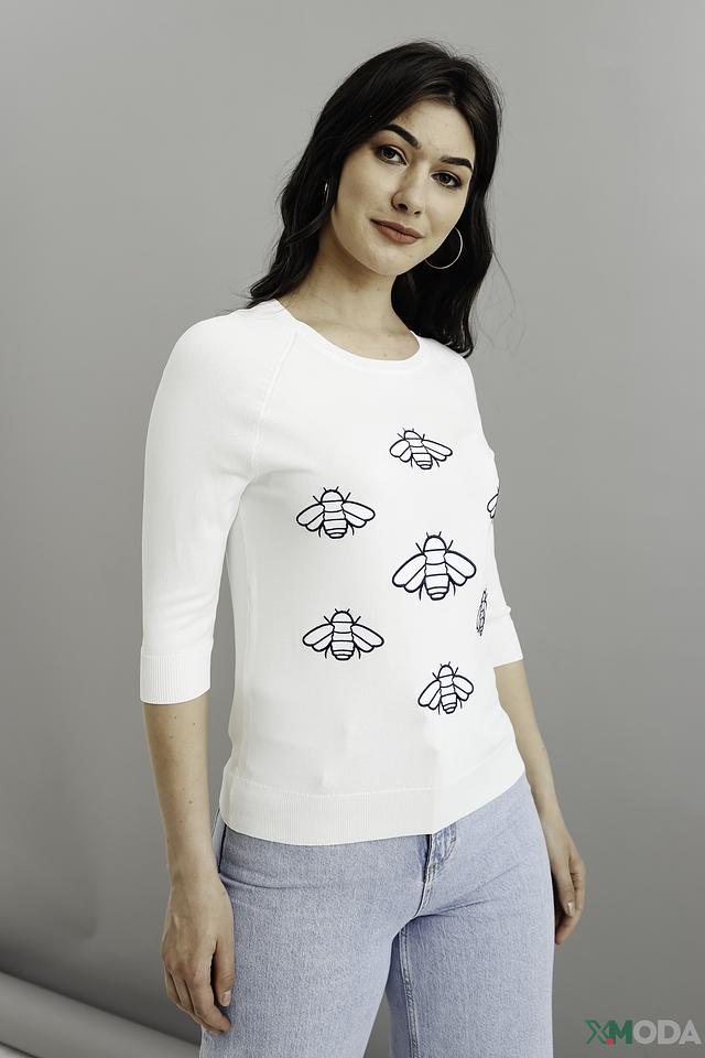 Этот стильный джемпер от i Blues выполнен в белом цвете и украшен милым принтом в виде пчел. Модель имеет круглый вырез горловины и 3/4 рукава, что делает ее универсальной для различных образов.