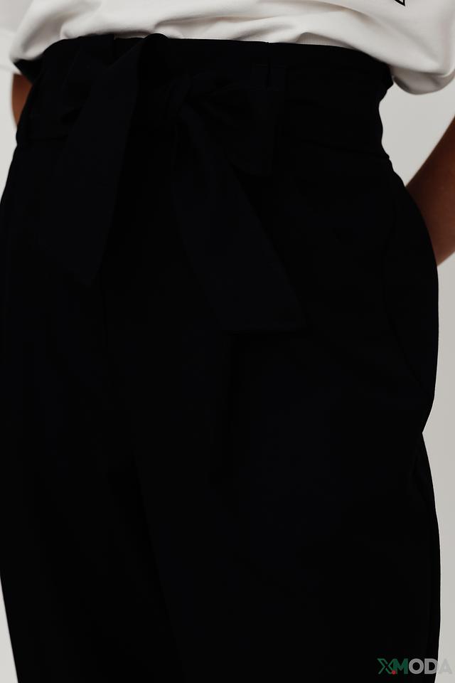Брюки имеют прямой крой и высокую посадку, что обеспечивает комфортную посадку и подчеркивает достоинства фигуры. Акцентный пояс с завязками добавляет образу изысканности и позволяет регулировать посадку по талии.