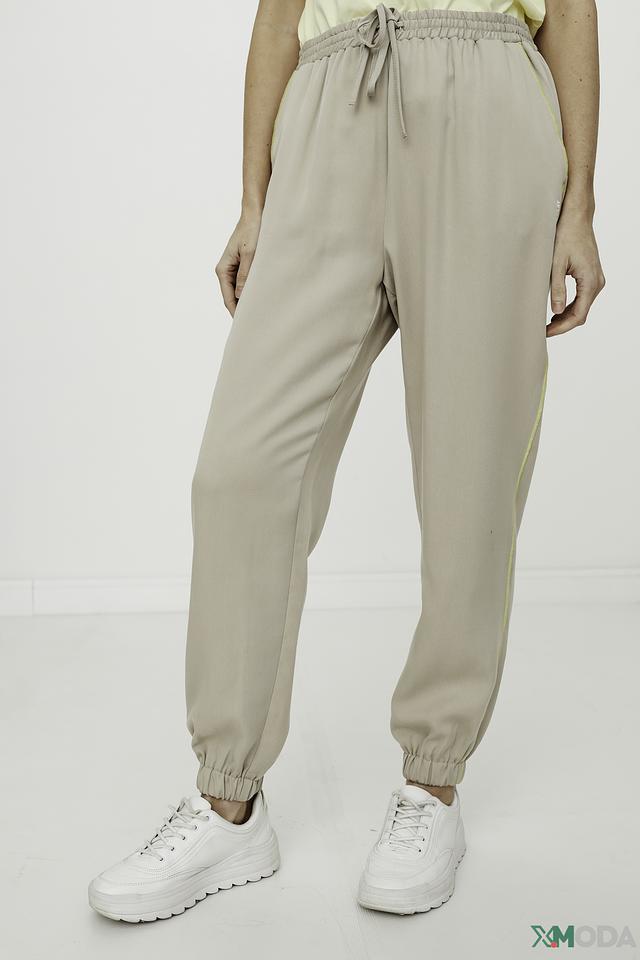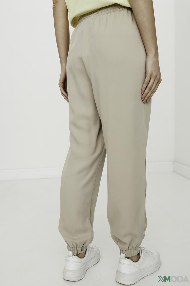 Особенностью модели является декоративная полоска светло-зелёного цвета, проходящая вдоль бокового шва. Брюки имеют эластичный пояс с кулиской, регулируемой шнурком, и манжеты внизу штанин. Это обеспечивает удобную посадку по фигуре и позволяет адаптировать брюки под индивидуальные предпочтения.