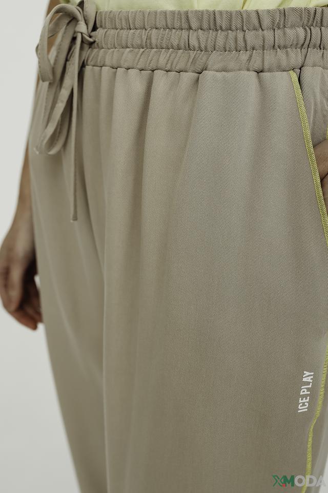 Женские брюки Ice Play бежевого цвета с контрастной полоской по боковому шву — стильное и комфортное решение для повседневного образа. Модель выполнена из смесовой ткани с добавлением льна, что обеспечивает воздухопроницаемость и приятные тактильные ощущения. Состав: лен 69%, полиэстер 31%