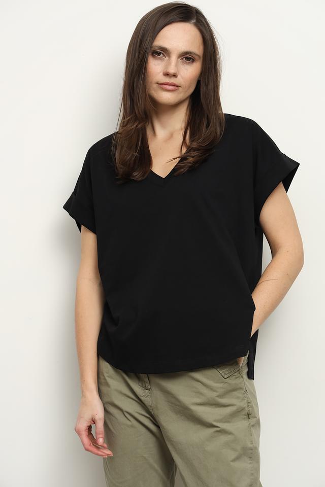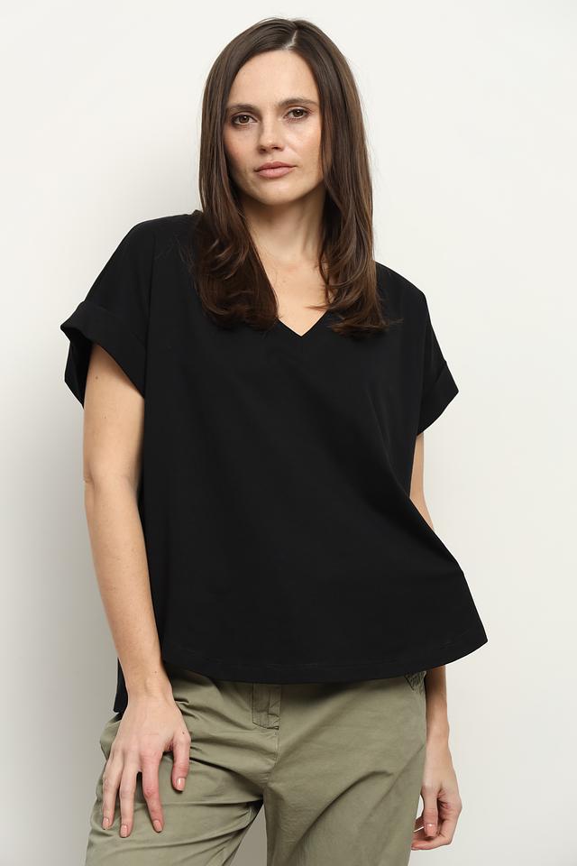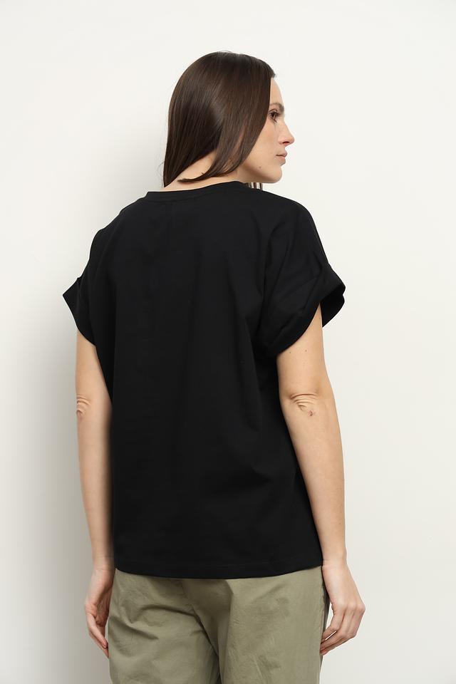 Чёрная футболка Icona женского кроя с короткими рукавами и V-образным вырезом. Изготовлена из 100% хлопка, обеспечивающего комфорт и воздухопроницаемость. Отличается свободным силуэтом и небольшим разрезом по низу. Состав: хлопок 100%