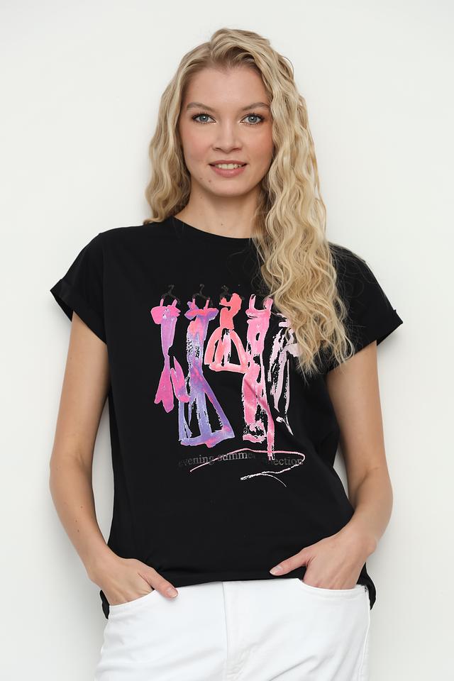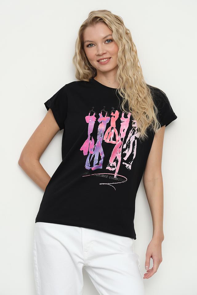 Основной цвет футболки – чёрный, который служит идеальным фоном для яркого и оригинального принта. Принт выполнен в разнообразной цветовой гамме, включая розовые, лиловые и белые оттенки, создавая эффектный визуальный акцент.