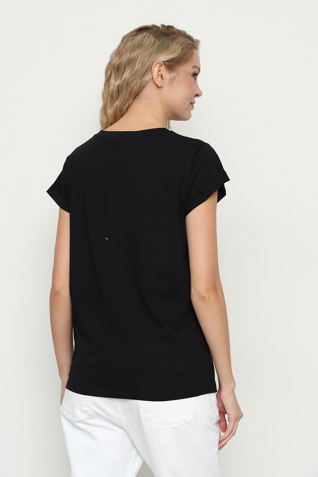 Чёрная футболка Icona женского кроя с ярким принтом. Изготовлена из 100% хлопка, обеспечивающего комфорт и воздухопроницаемость. Стильный и удобный вариант для повседневного образа. Состав: хлопок 100%