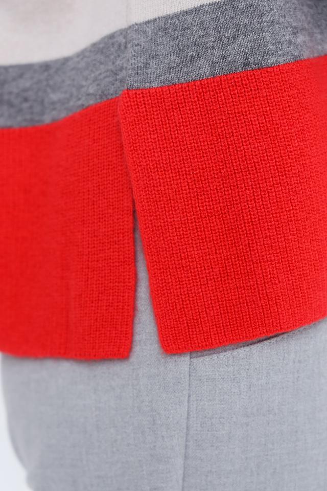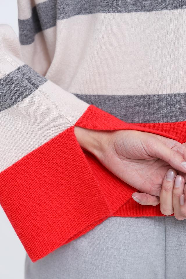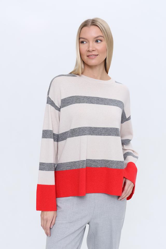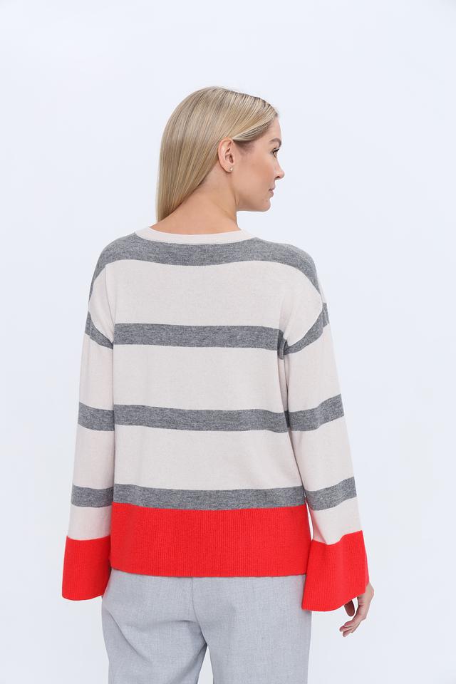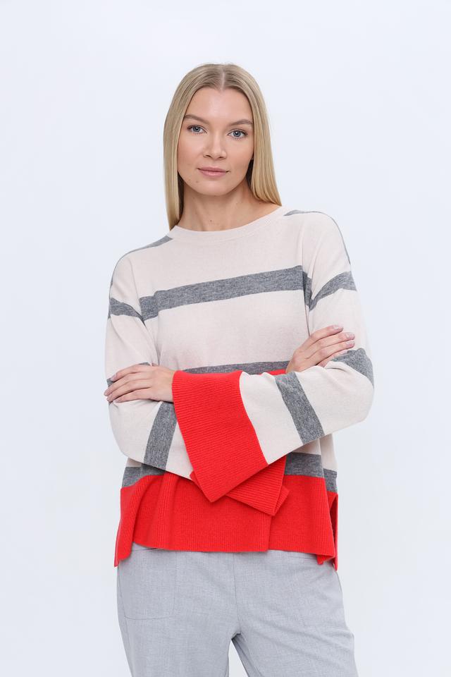 Женский джемпер Icona красного, серого и бежевого цвета с полосками. Модель выполнена из мягкой шерсти с добавлением кашемира, имеет оригинальный крой с расклешенными рукавами. Состав: шерсть 90%, кашемир 10%