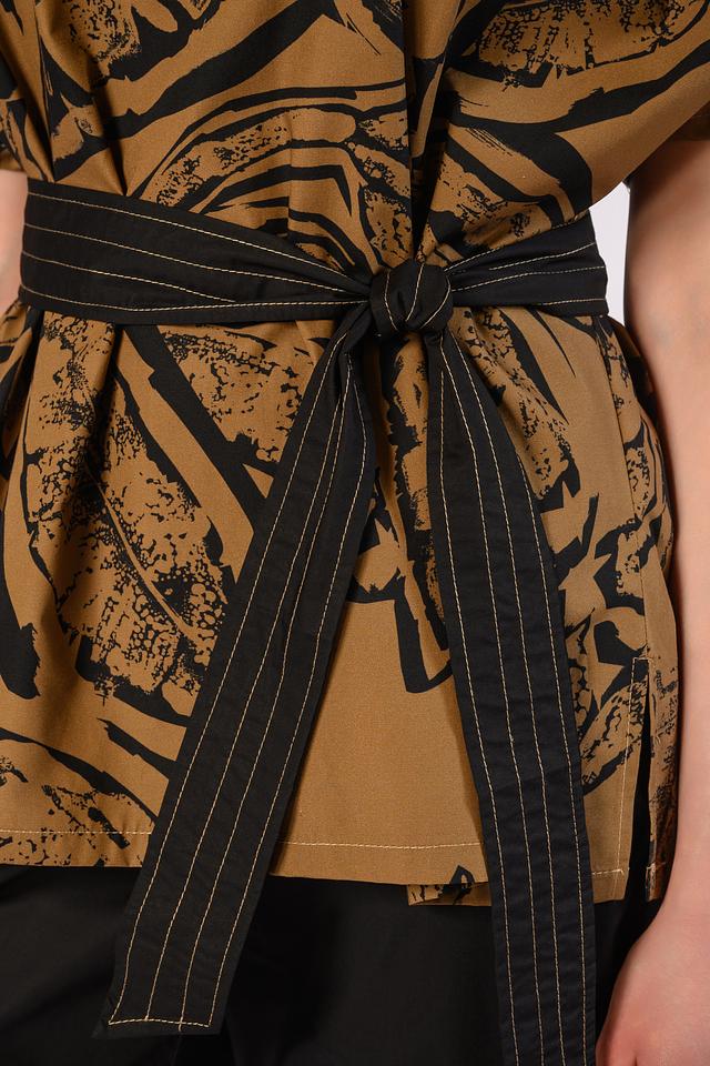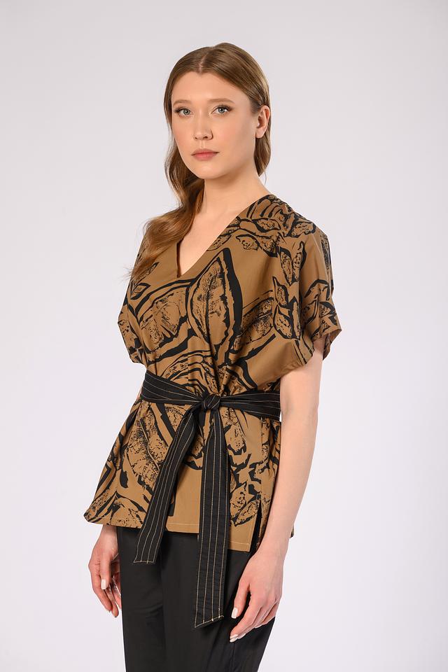 Модель имеет свободный крой, короткие рукава и V-образный вырез горловины. Блуза дополнена тонким черным поясом, который позволяет подчеркнуть талию и создать более женственный силуэт.