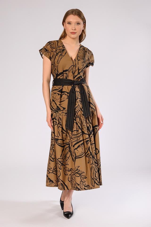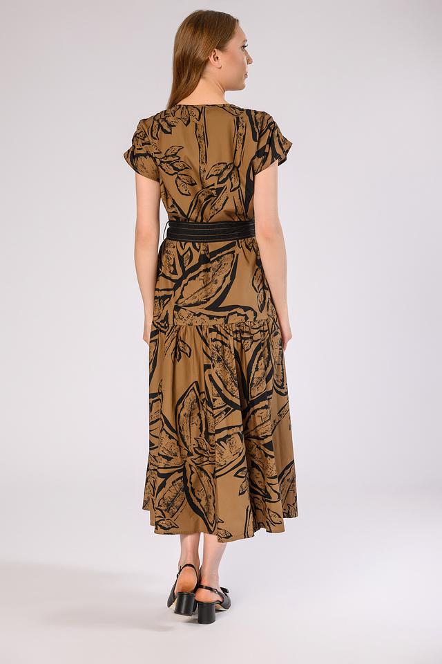 Платье имеет длину миди, V-образный вырез и короткие рукава. Главная особенность – яркий принт с изображением листьев и растительных мотивов в коричневой гамме. Подчеркнуть талию позволяет притачной пояс.