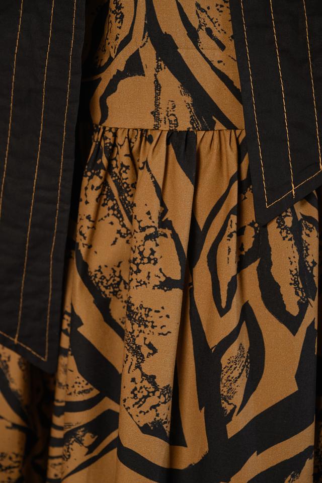 Платье Icona коричневого цвета с оригинальным растительным принтом – стильное и комфортное решение для создания женственного образа. Модель выполнена из 100% хлопка, имеет V-образный вырез и акцентный пояс. Состав: хлопок 100%