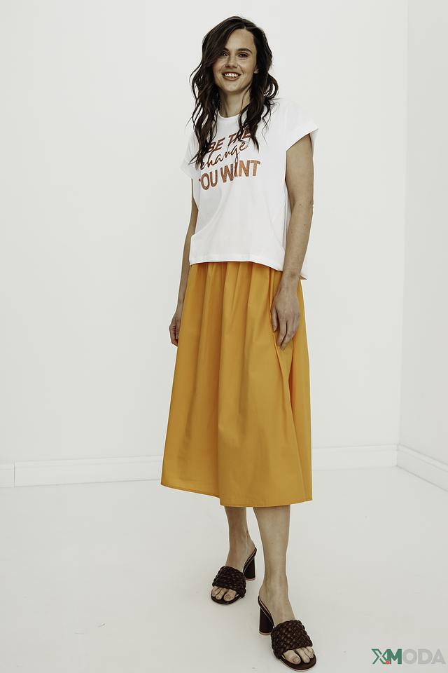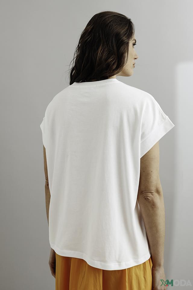 Футболка имеет прямой крой, короткие рукава с подворотами и круглый вырез горловины. Благодаря своему универсальному дизайну, она легко сочетается с различными элементами гардероба – от джинсов и шорт до юбок и брюк.