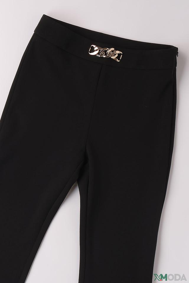 Особенностью модели является декор на поясе в виде стильной металлической цепочки, которая придаёт брюкам более нарядный вид. Клёш от колена делает силуэт более женственным и изящным. Данные брюки идеально подойдут для повседневной носки, а также для особых случаев.