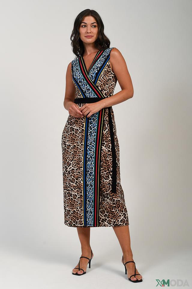 Платье имеет приталенный силуэт и длину миди. V-образный вырез декорирован яркими полосами синего, красного и чёрного цветов, которые гармонично сочетаются с леопардовым принтом основной части платья.