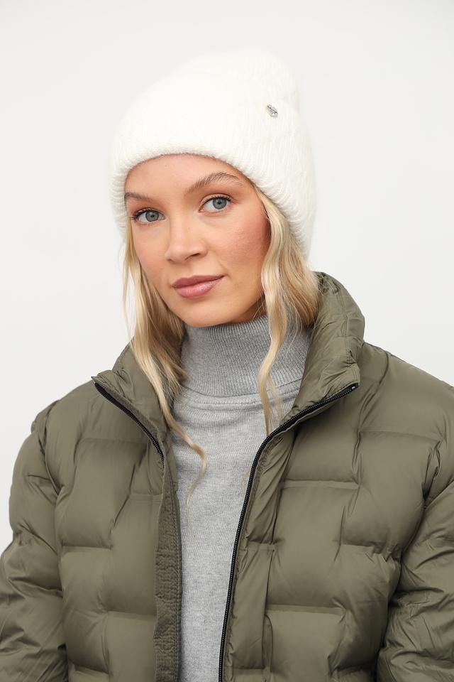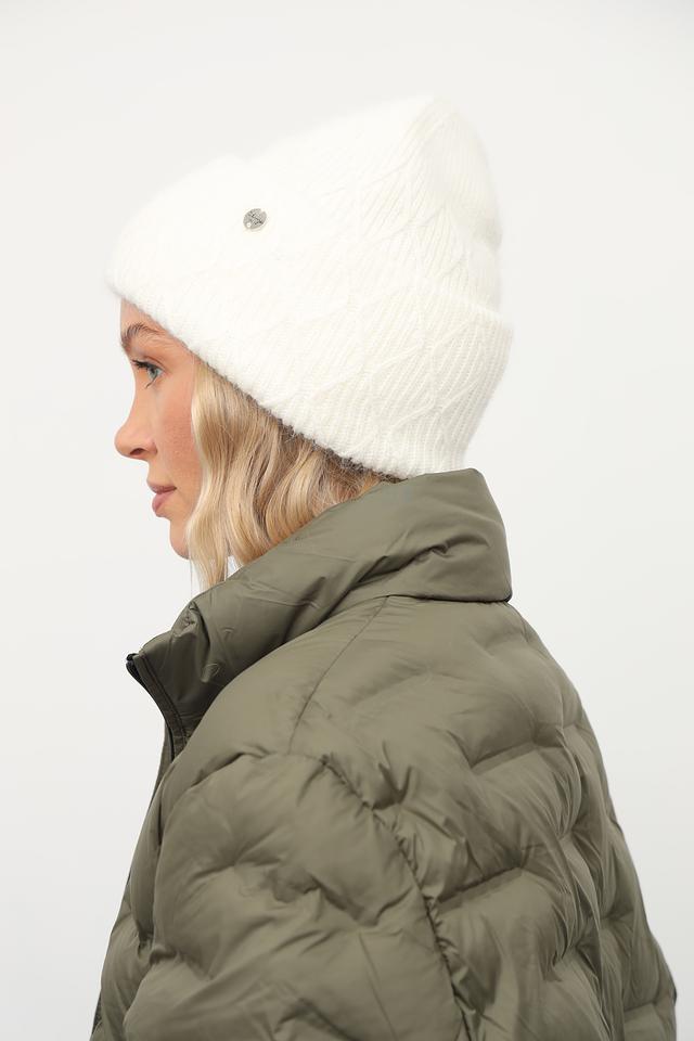 На шапке расположен небольшой металлический логотип бренда, который добавляет изысканности и узнаваемости. Белый цвет шапки универсален и легко сочетается с различными видами верхней одежды и повседневной одеждой. Состав изделия включает 30% ангоры, 30% вискозы, 30% нейлона и 10% шерсти.