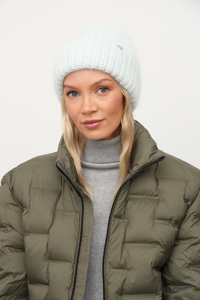 Шапка выполнена из высококачественной смеси ангоры (60%) и полиамида (40%), что обеспечивает мягкость, легкость и долговечность изделия. Текстура крупной вязки придает шапке объемный вид.