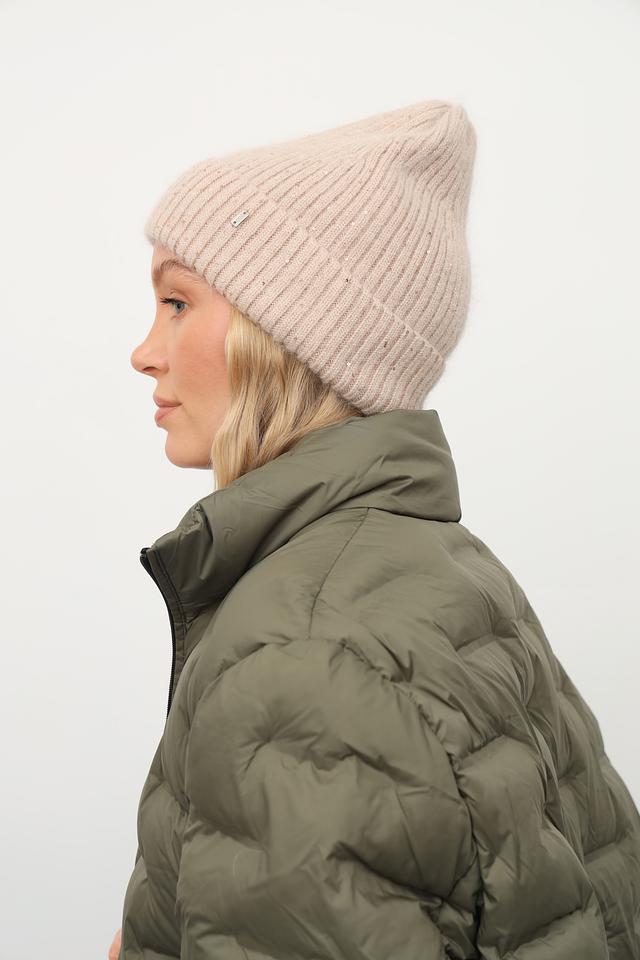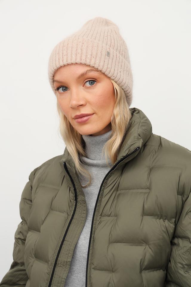 Бежевый цвет шапки универсален и легко сочетается с различными видами верхней одежды. Декоративные пайетки добавляют изысканности и делают этот аксессуар подходящим для особых случаев.