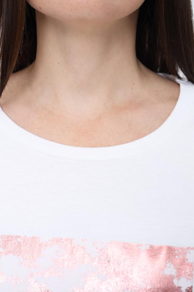 Особенностью данной модели является яркий и стильный принт в розово-красных тонах, который добавляет образу индивидуальности. Футболка имеет классический прямой крой и круглый вырез горловины, что делает ее универсальной и подходящей для любого типа фигуры.