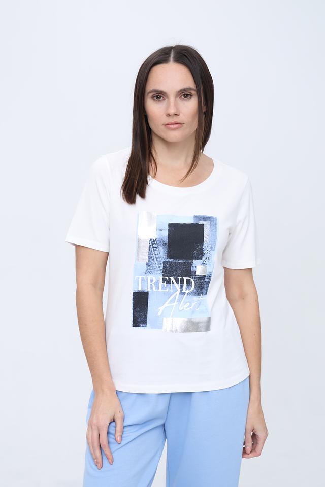 Особенностью данной модели является яркий и современный принт в сине-черной гамме, который добавляет образу индивидуальности. Футболка имеет классический прямой крой и круглый вырез горловины, что делает ее универсальной и подходящей для различных типов фигур.