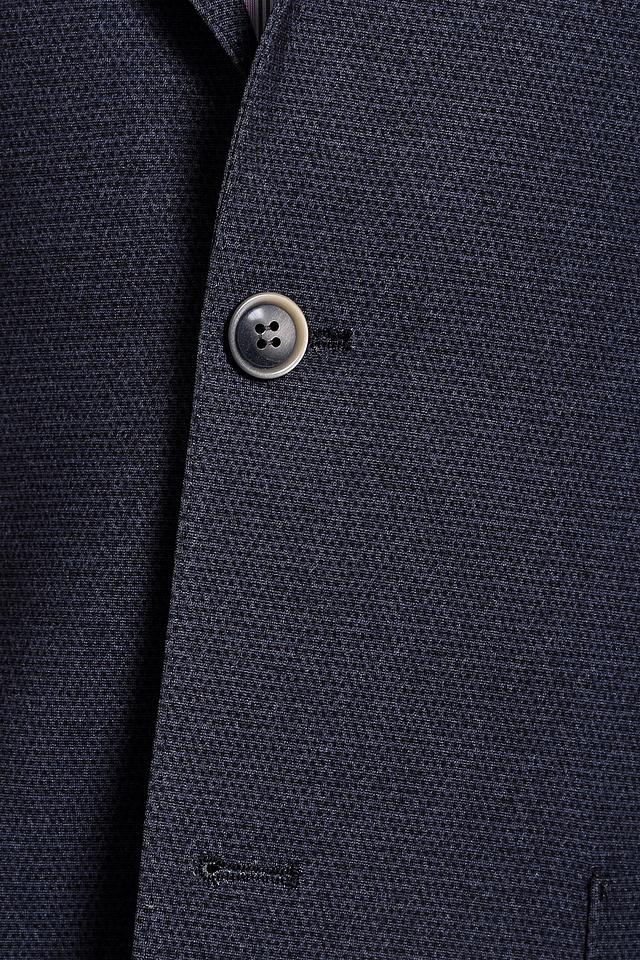 Пиджак имеет однобортную застёжку на две пуговицы, лацканы стандартной ширины и два боковых кармана с клапанами. Текстурированная ткань придает пиджаку особый шарм и делает его более интересным визуально. Подкладка выполнена из полиэстера.