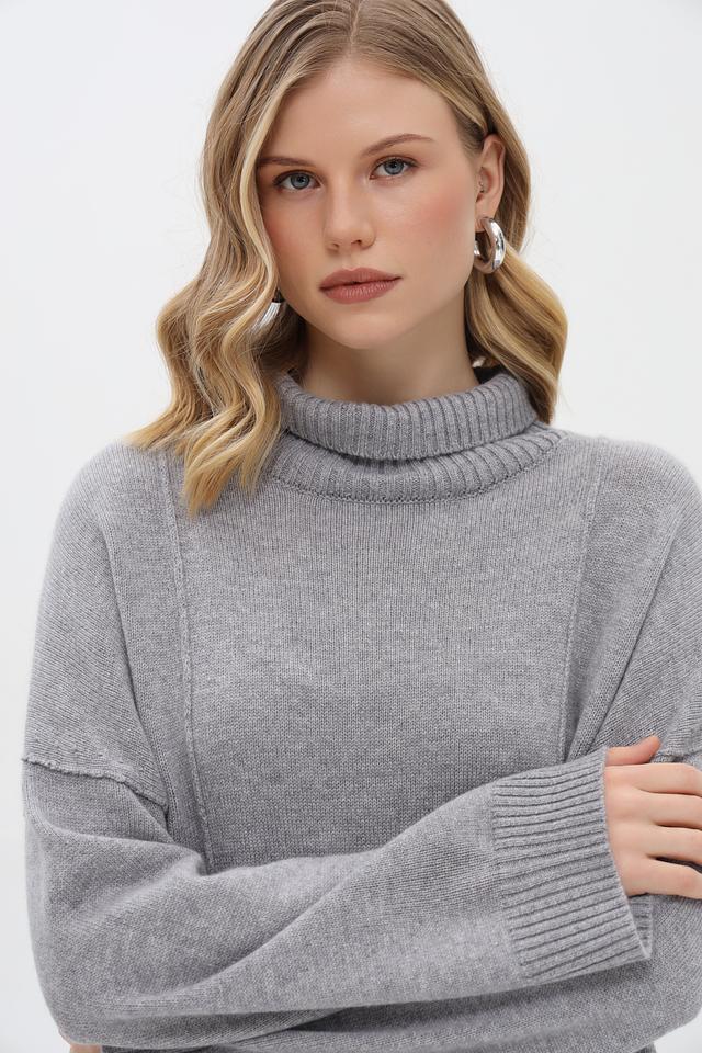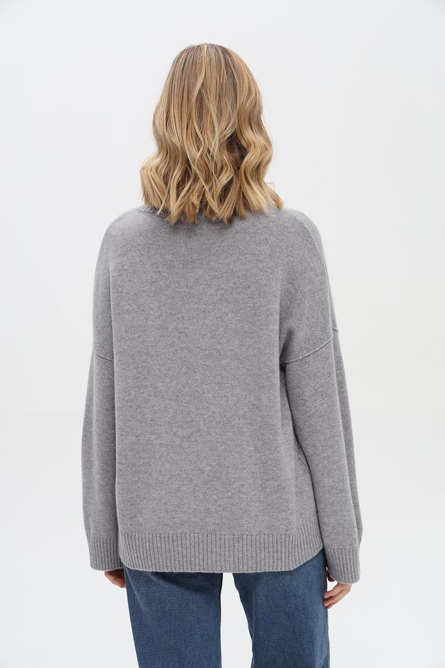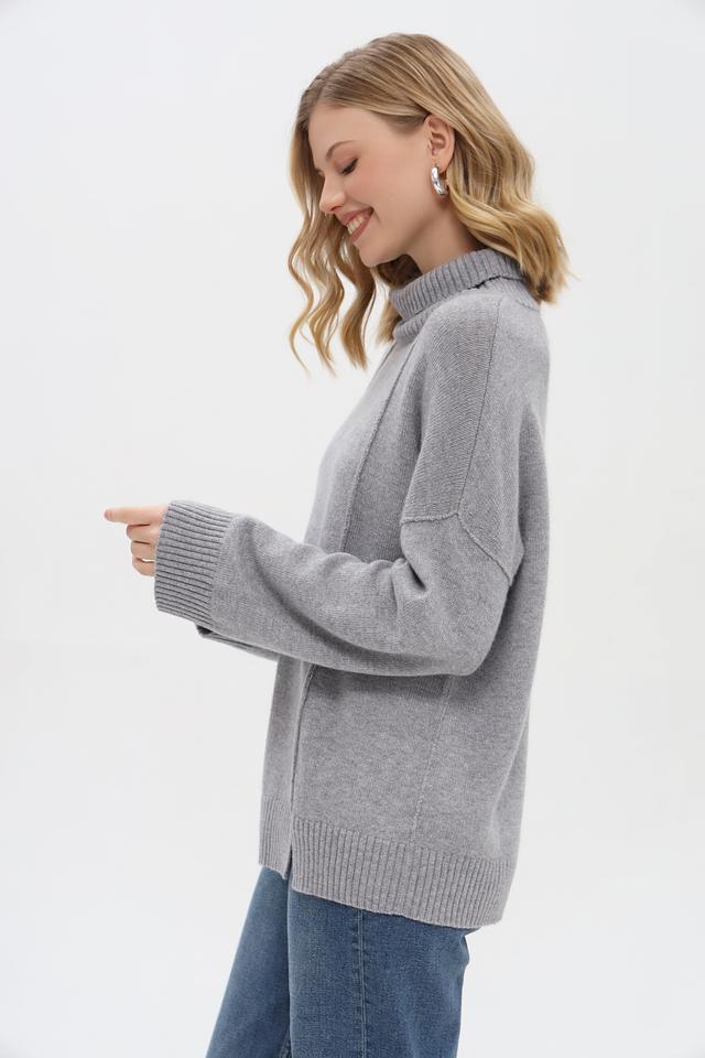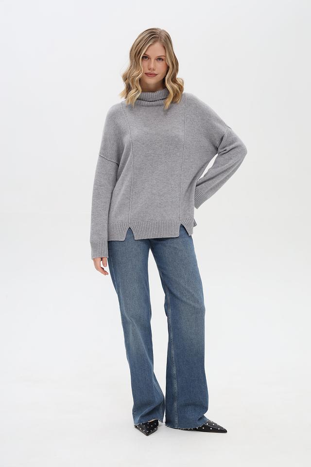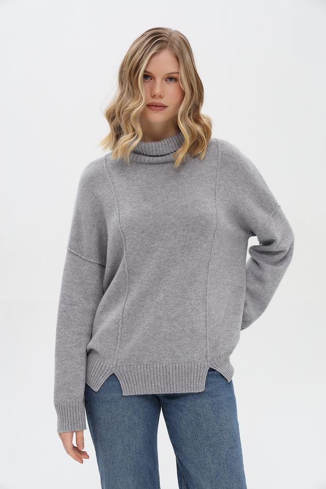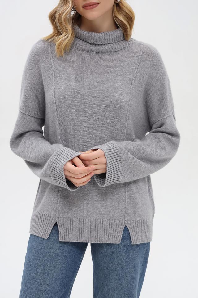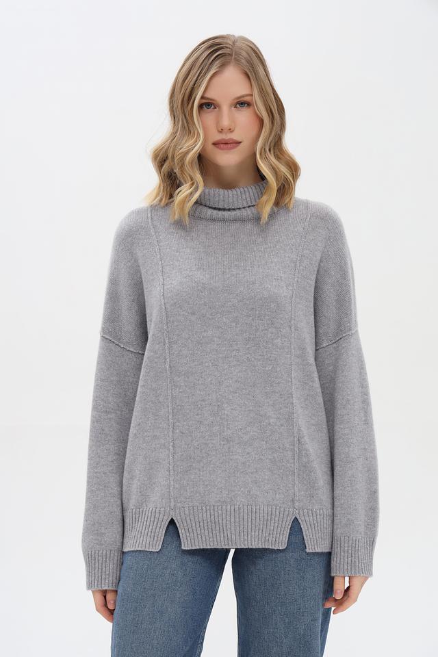 Особенностью данного пуловера являются разрезы по бокам, которые придают ему современный и оригинальный вид. Серый цвет делает его универсальным элементом гардероба, который легко сочетается с различными вещами.